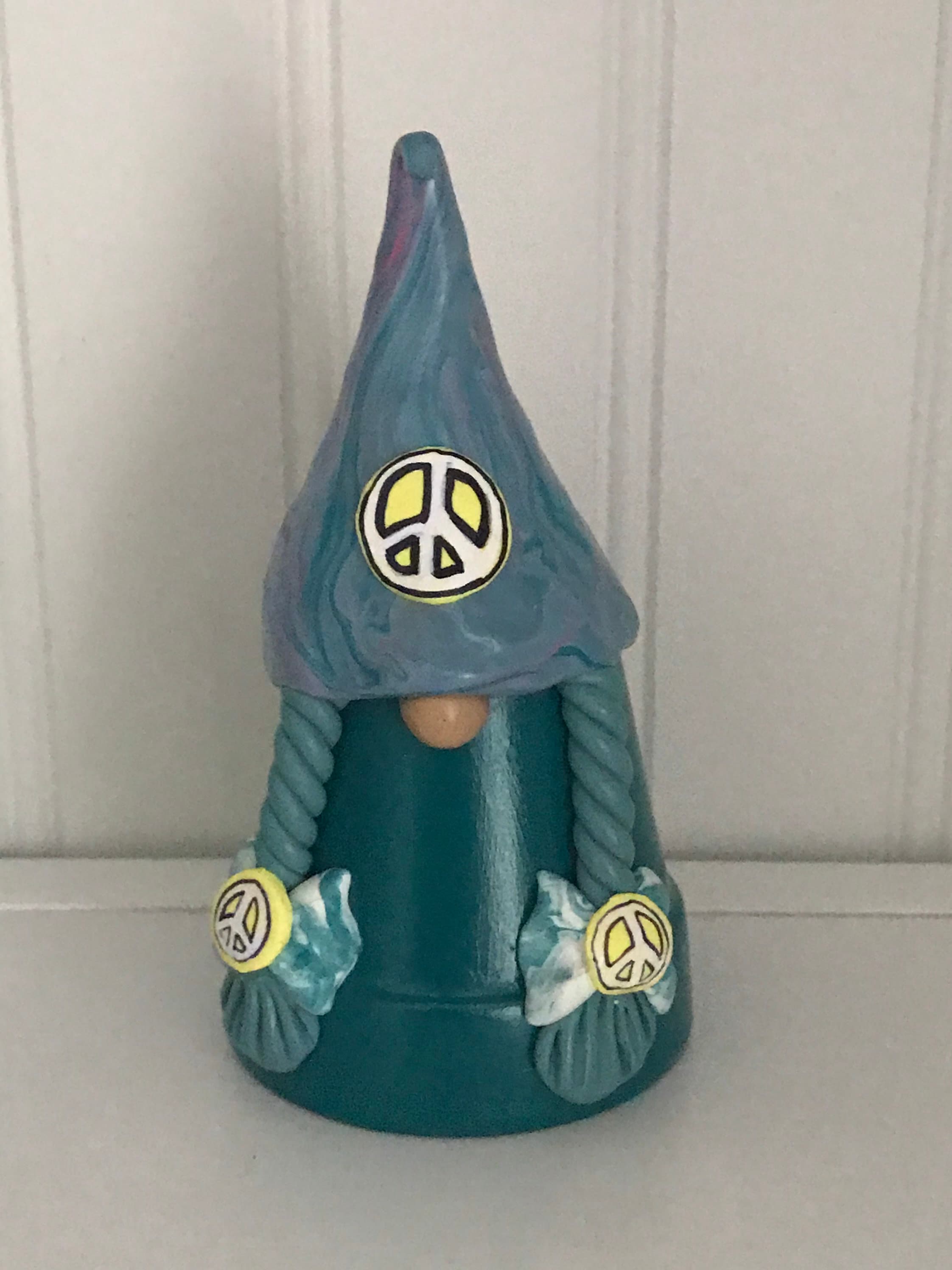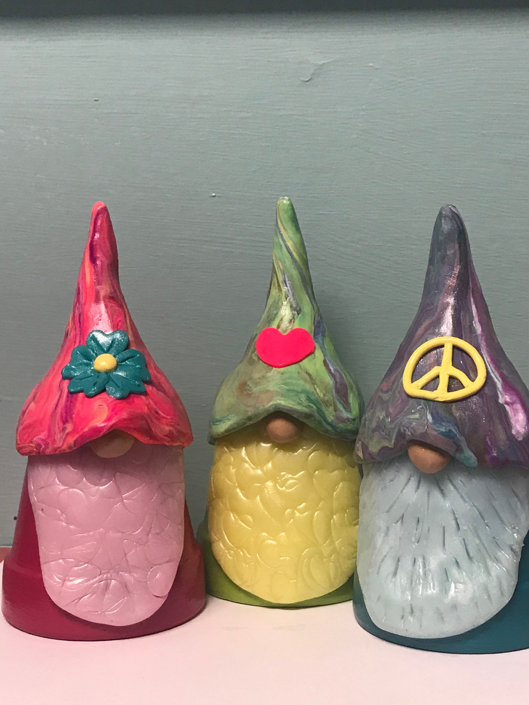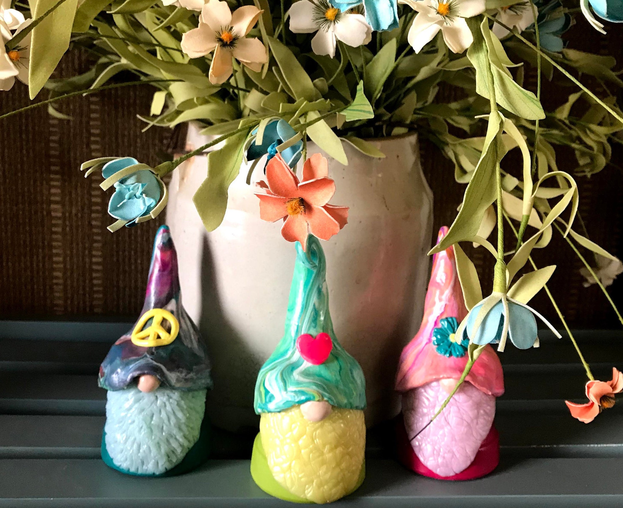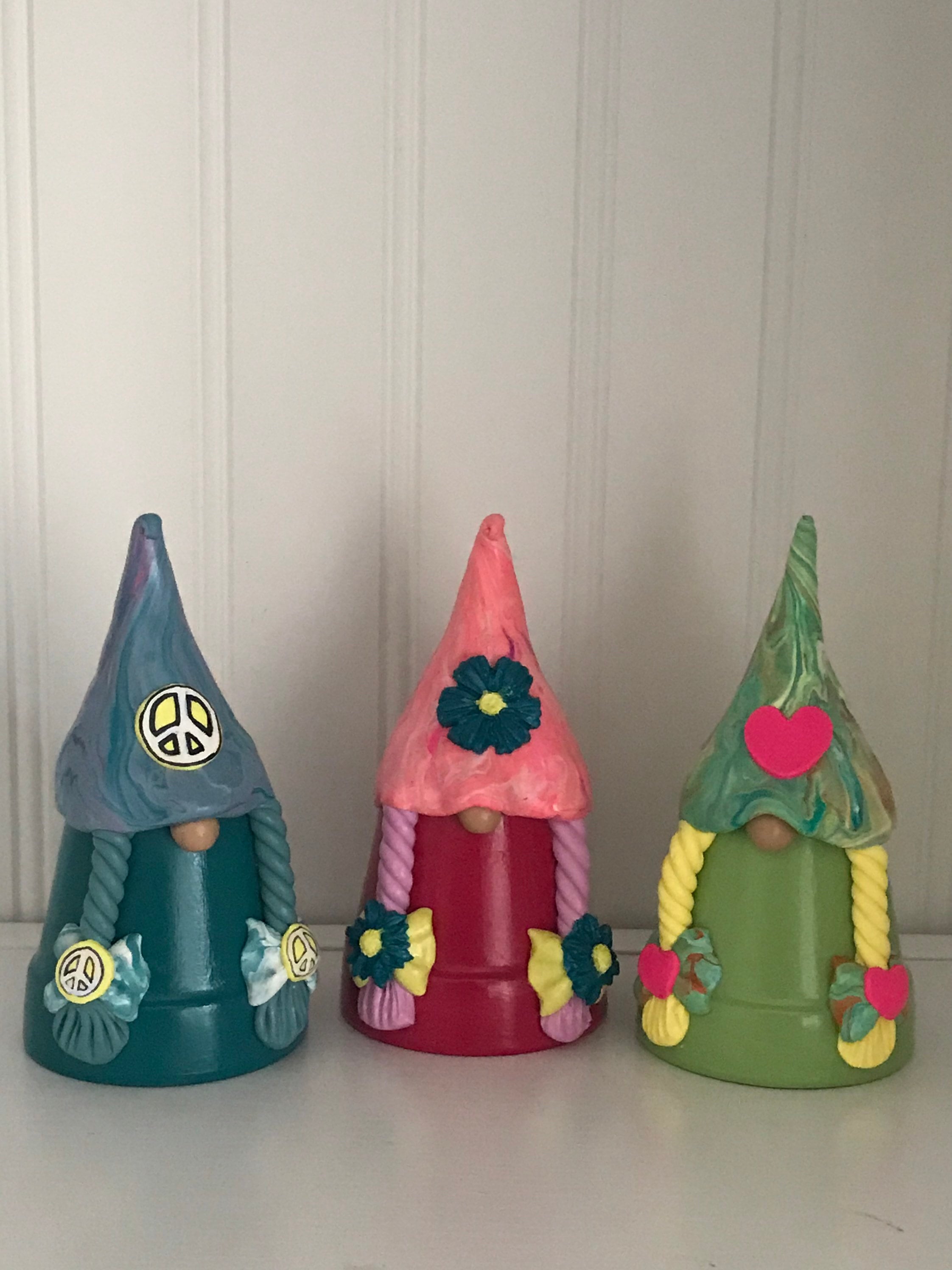 Set of Three Handmade Hippy Gnome Buddies - Scandinavian Styles. In colors as shown in pic. Peace! Love! and Let it be! Gnome Buddies are perfect for home or garden. Hand-made out of miniature flower pots and polymer clay, these little gnomes are whimsical and fun. Decorated with flowers, they are just delightful. Each one is waiting for the right home to bring love and positive energy into your life. They are available as 3 males or 3 females. You also have the choice of skin tones: Light, Medium (tan), Dark, or Custom. If you want a mixture of gender and/or skin tones, please message me.