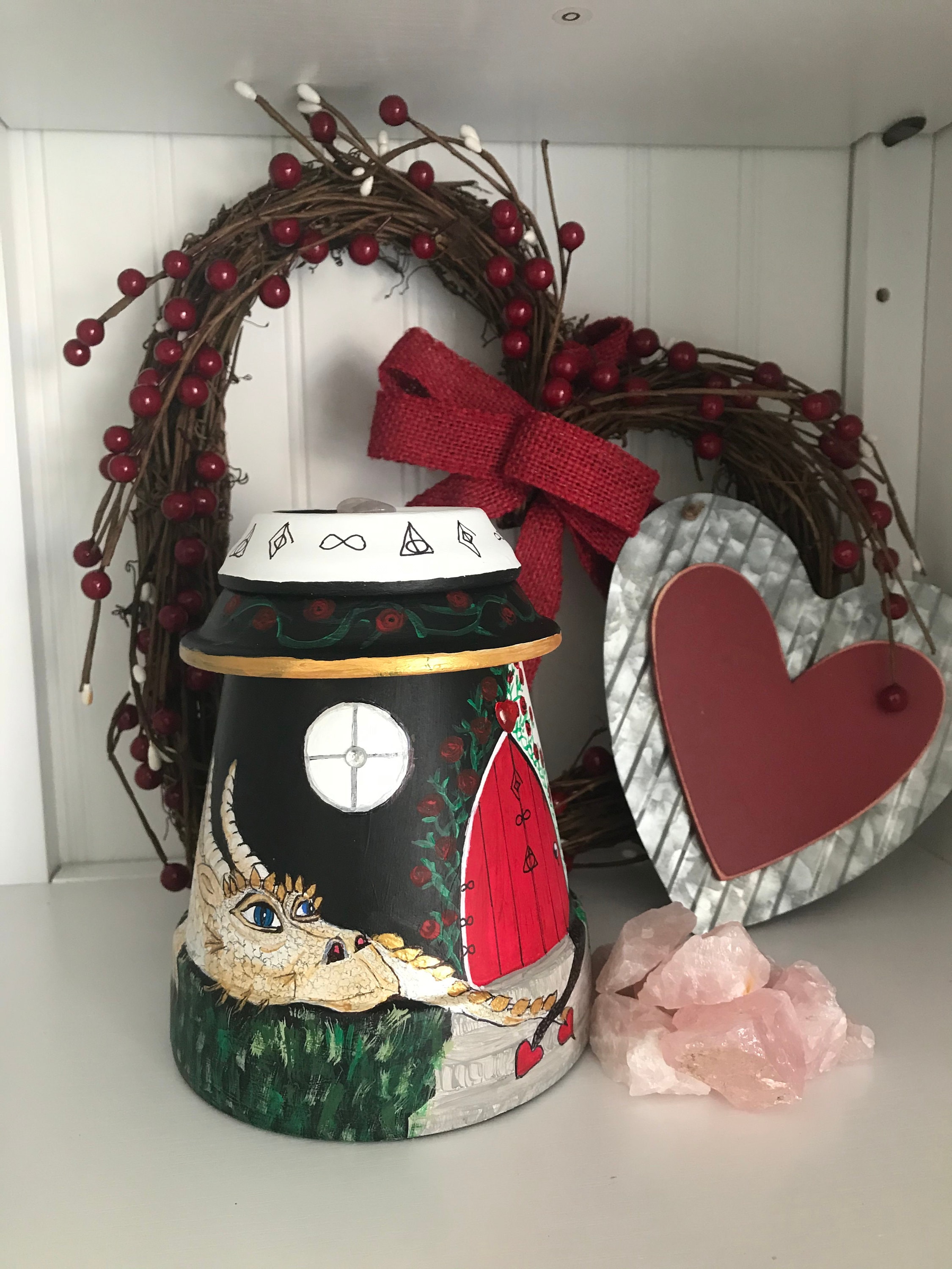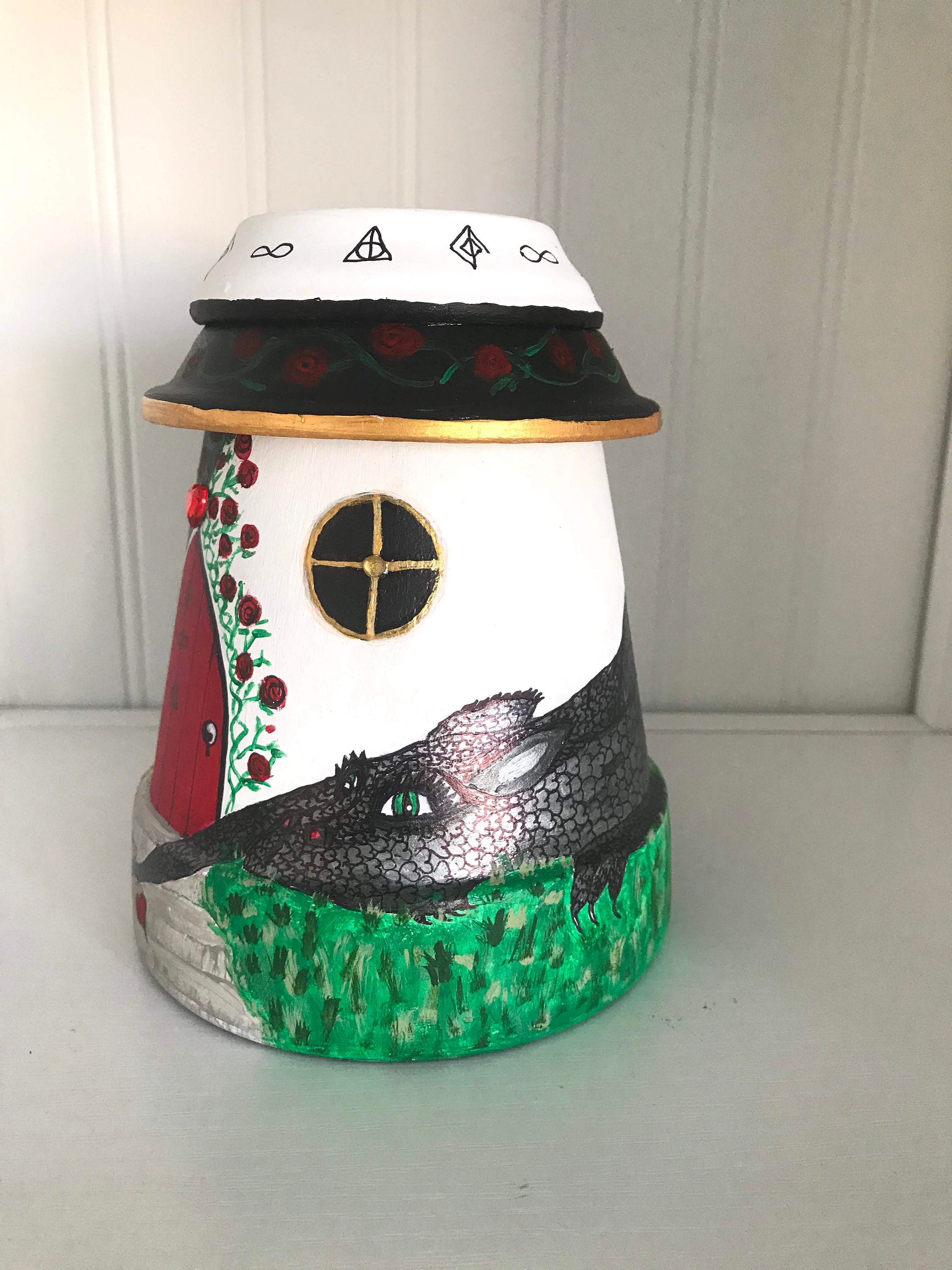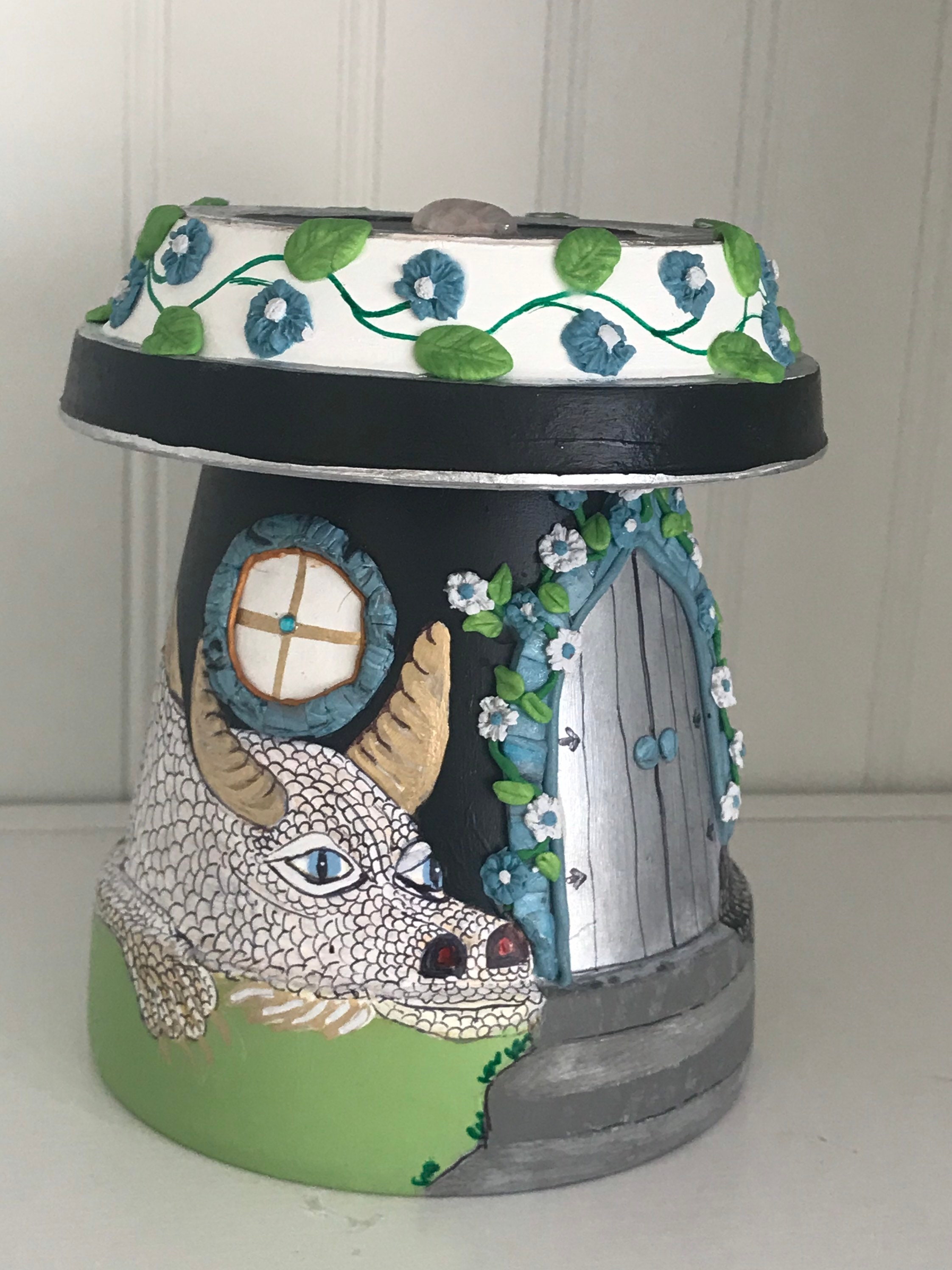 This particular fairy home is guarded by two love dragons who have found lasting love. The dragons are painted in White/Gold and Black/Silver.