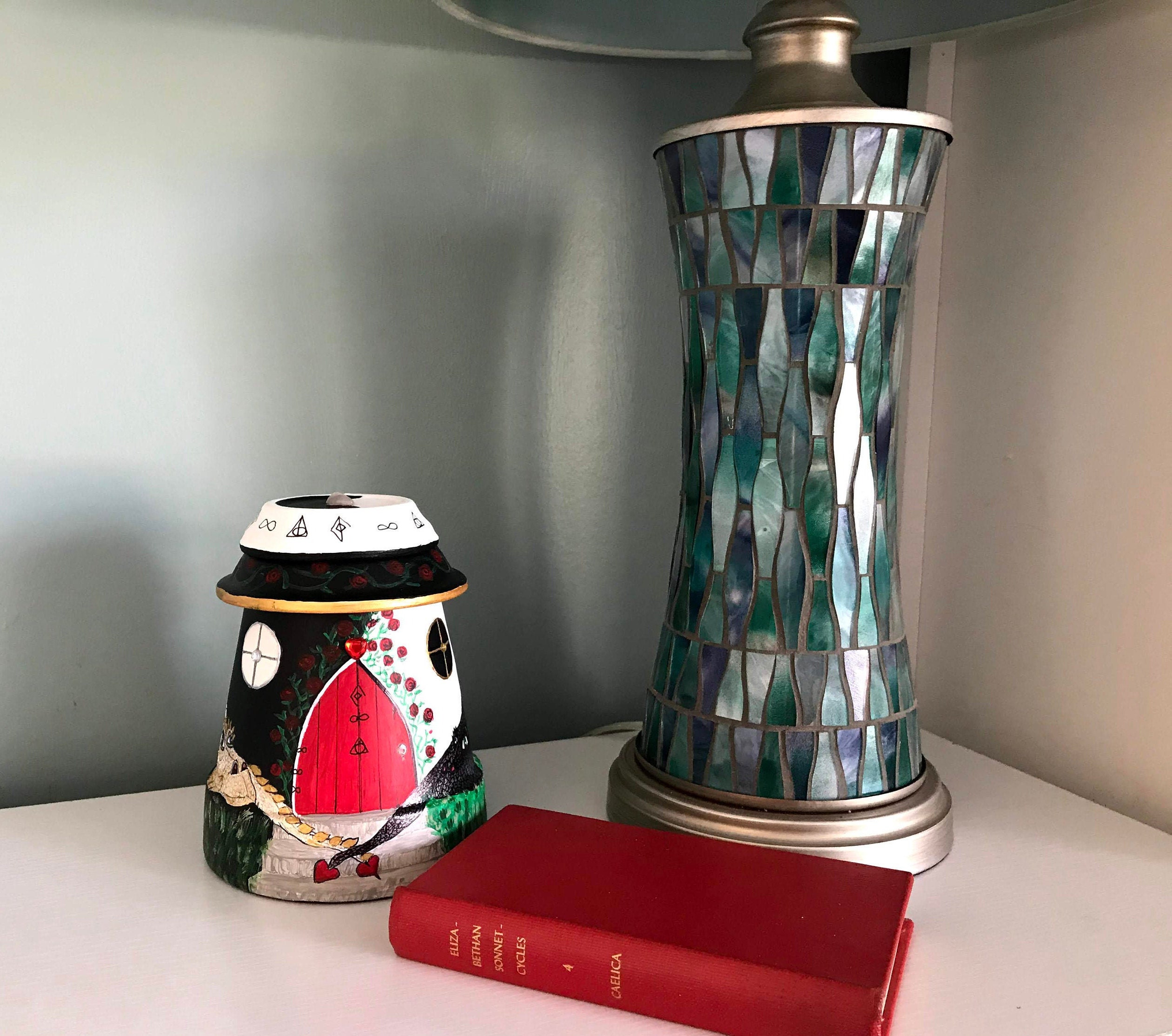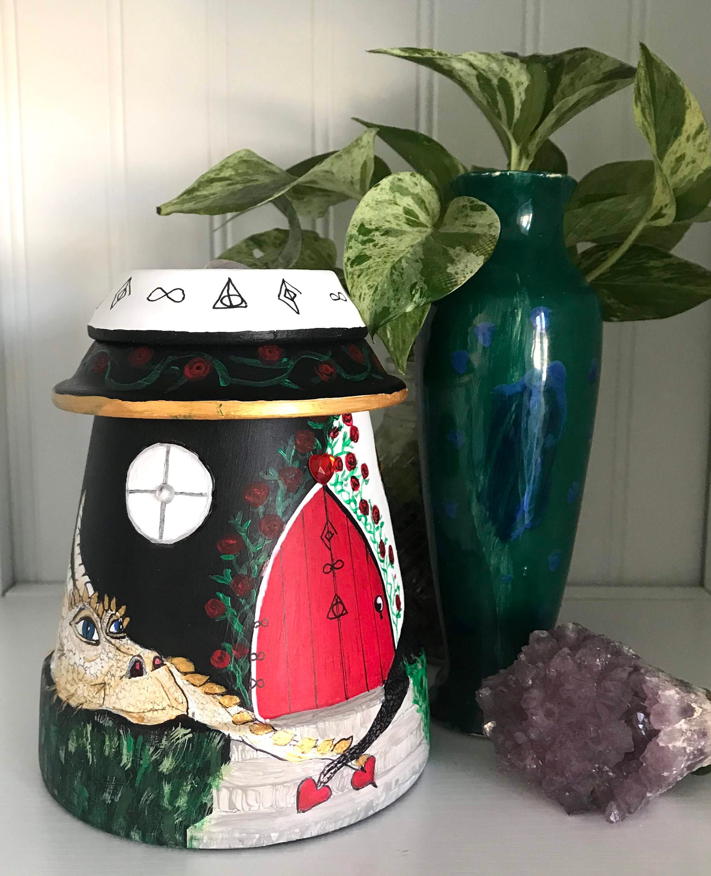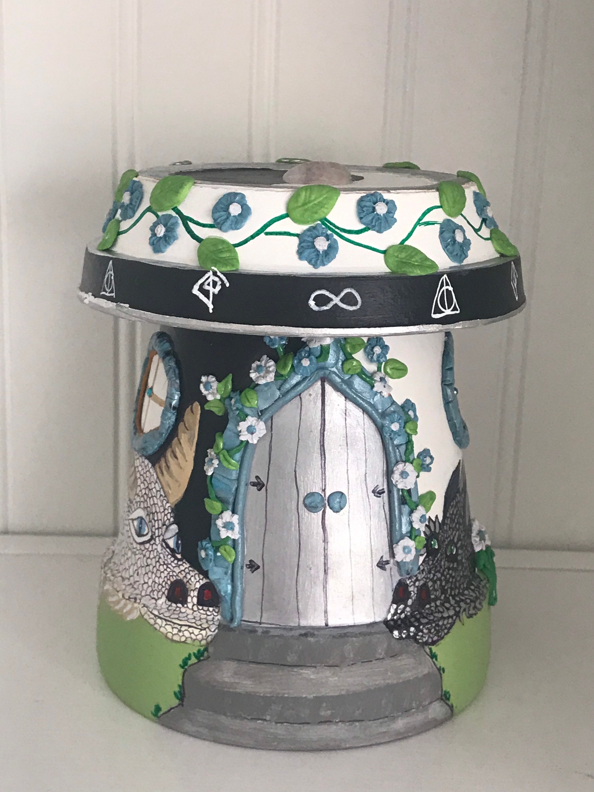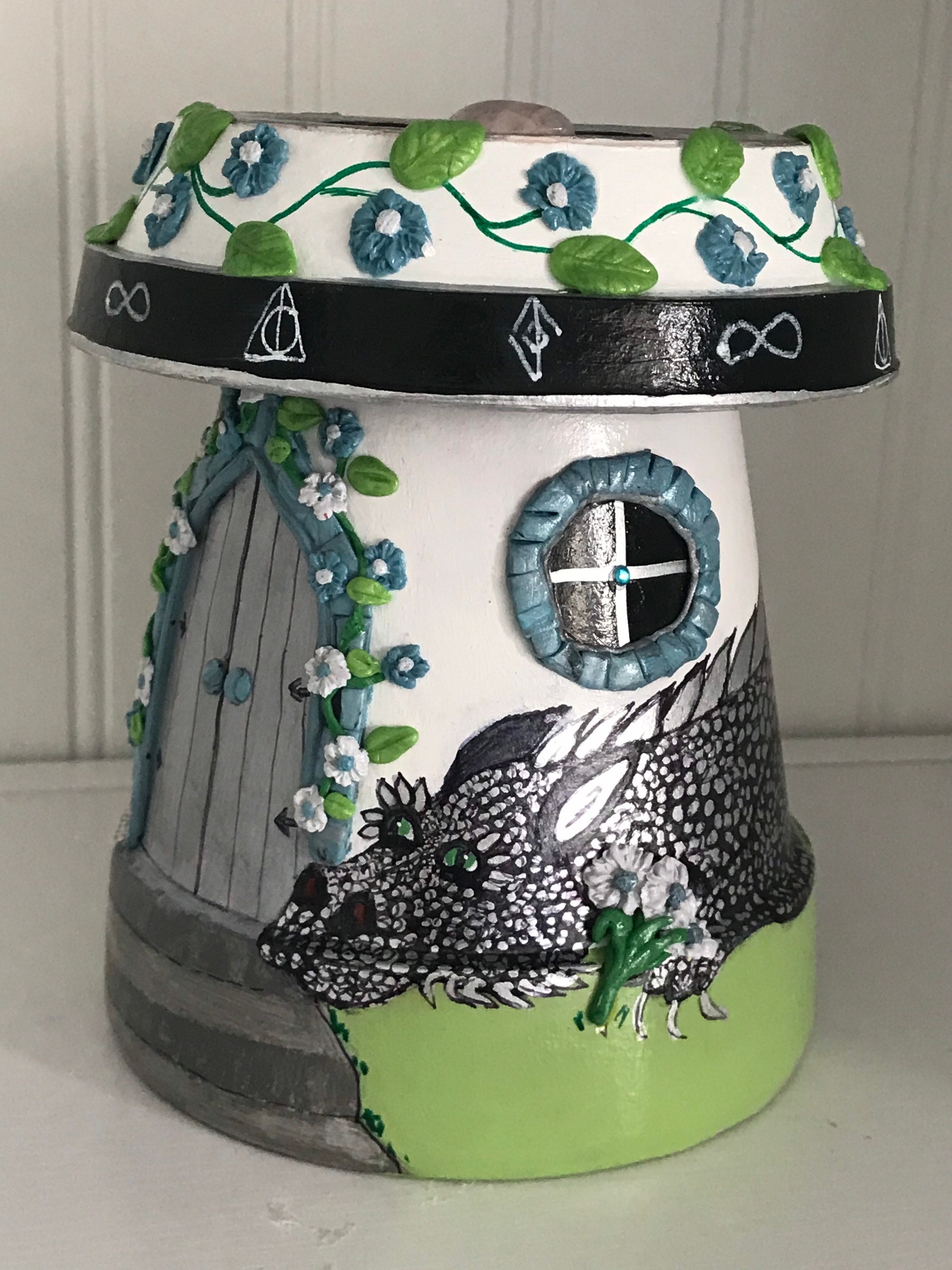 This particular fairy home is guarded by two love dragons who have found lasting love. The dragons are painted in White/Gold and Black/Silver.
