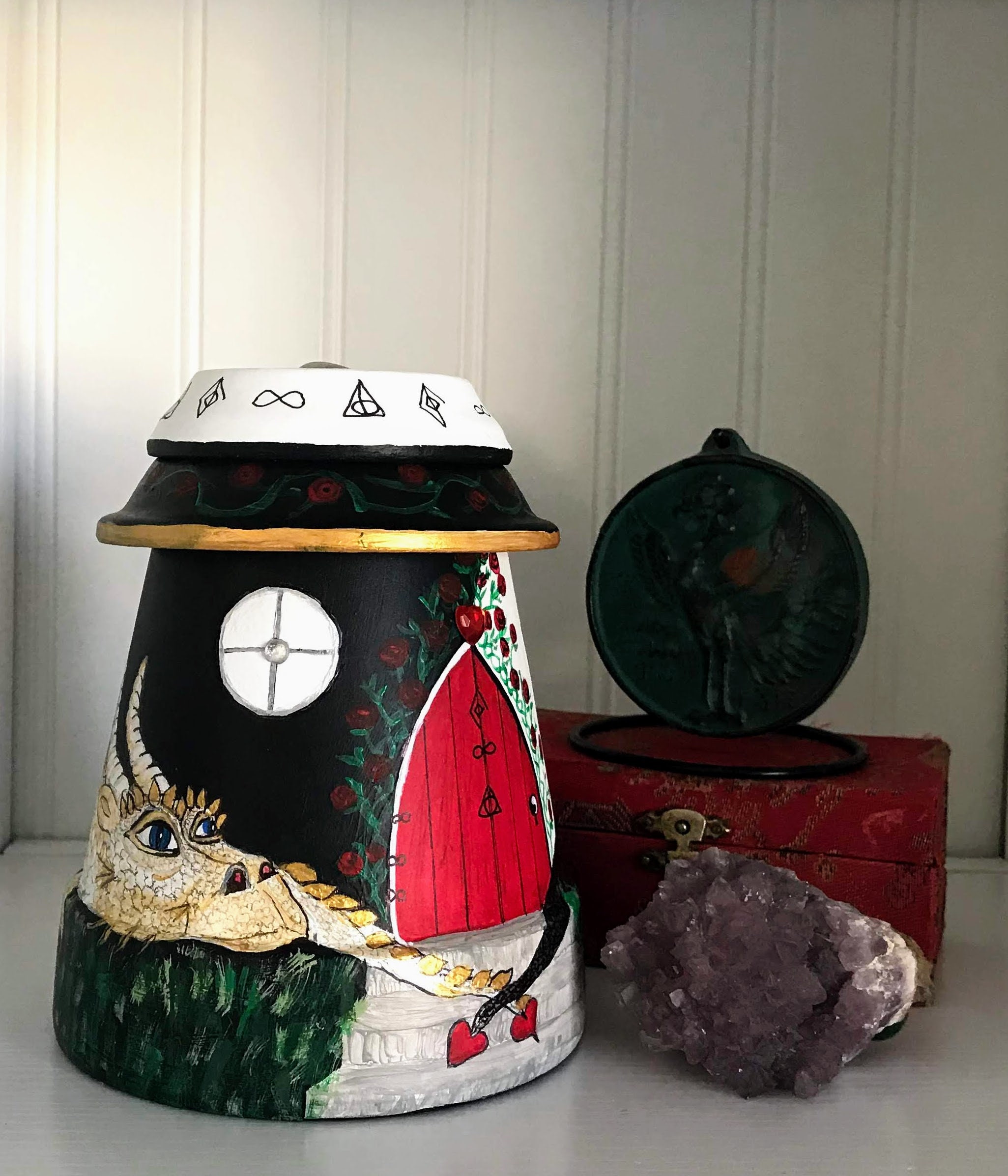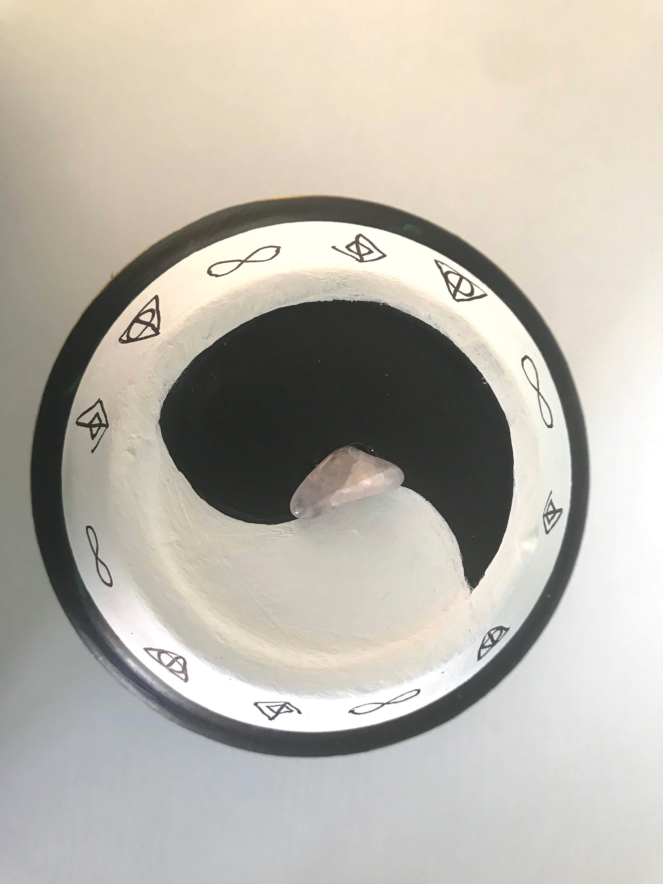 A rose quartz crystal is at the top of the pot in the middle of a Yin Yang symbol. Dragons love crystals. The Rose Quartz crystal is the stone of universal love.