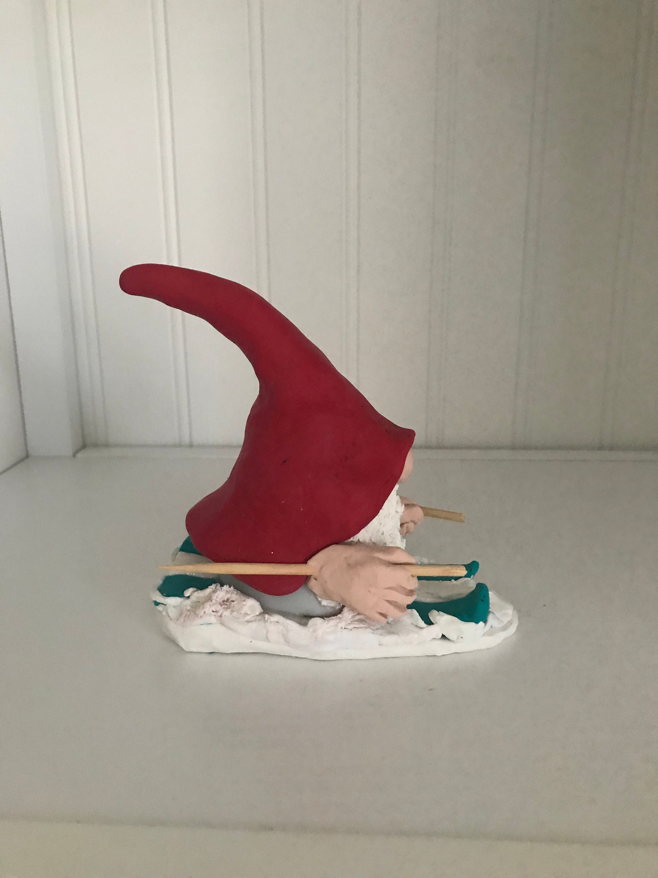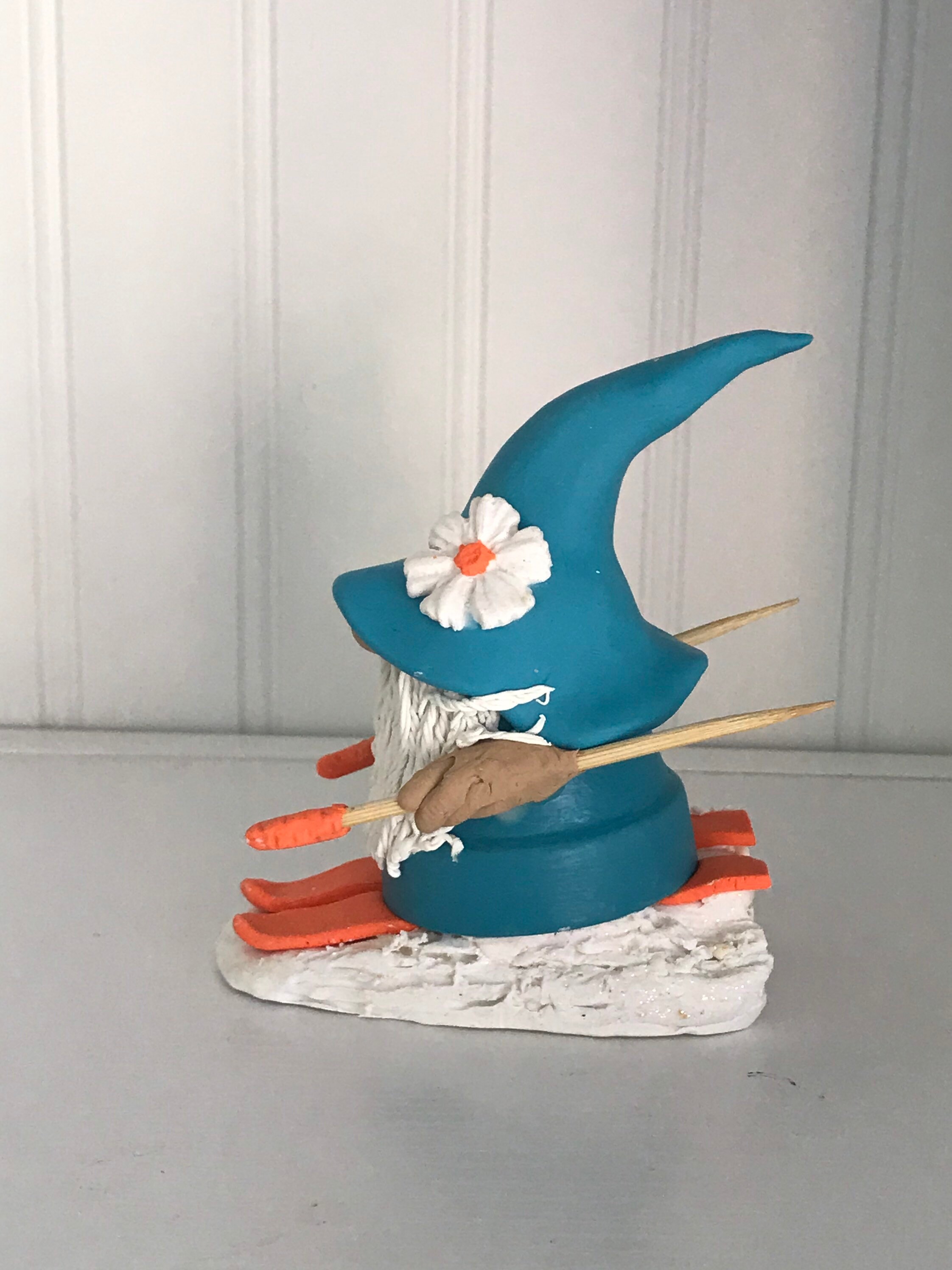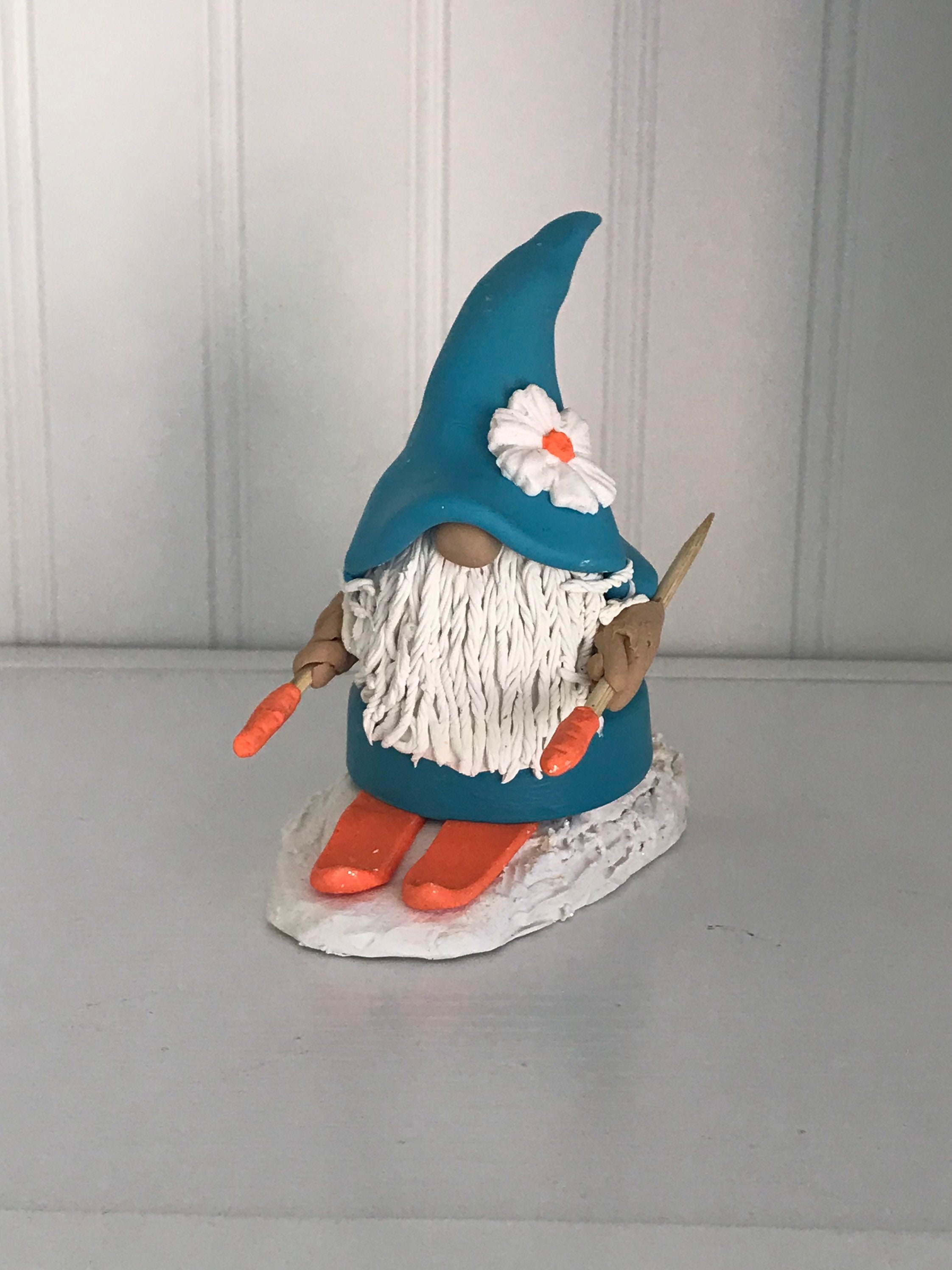 Gnomes love winter sports. This little handmade gnome especially loves snow skiing down tall mountains. This gnome is available as either male or female and a selection of skin tones. Tye hat decoration symbolizes the strength of a mountain. if you’d like a different hat decoration I can do it differently just message