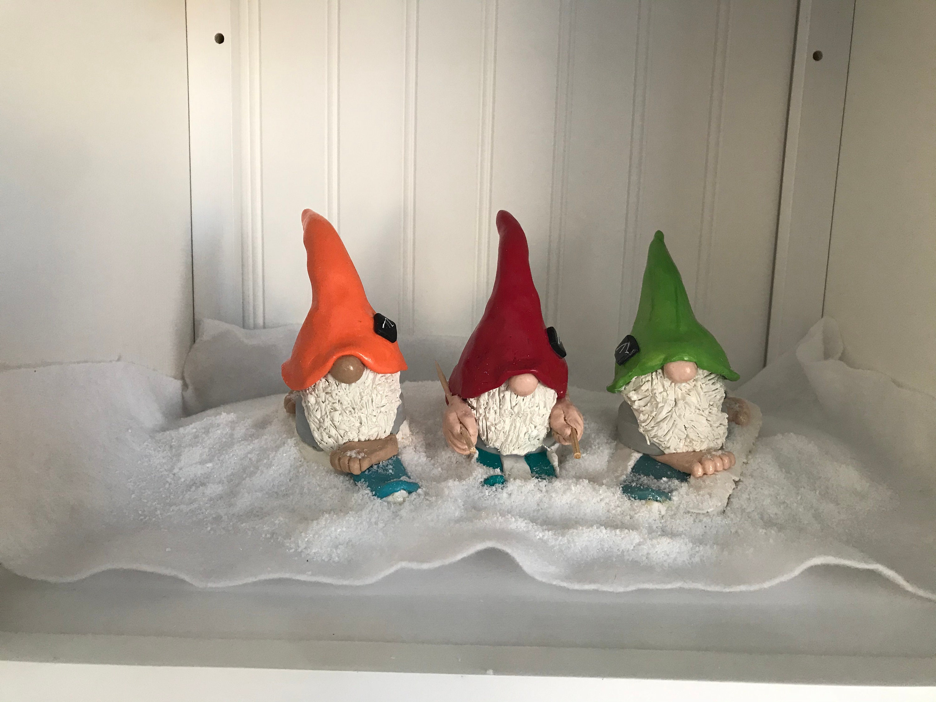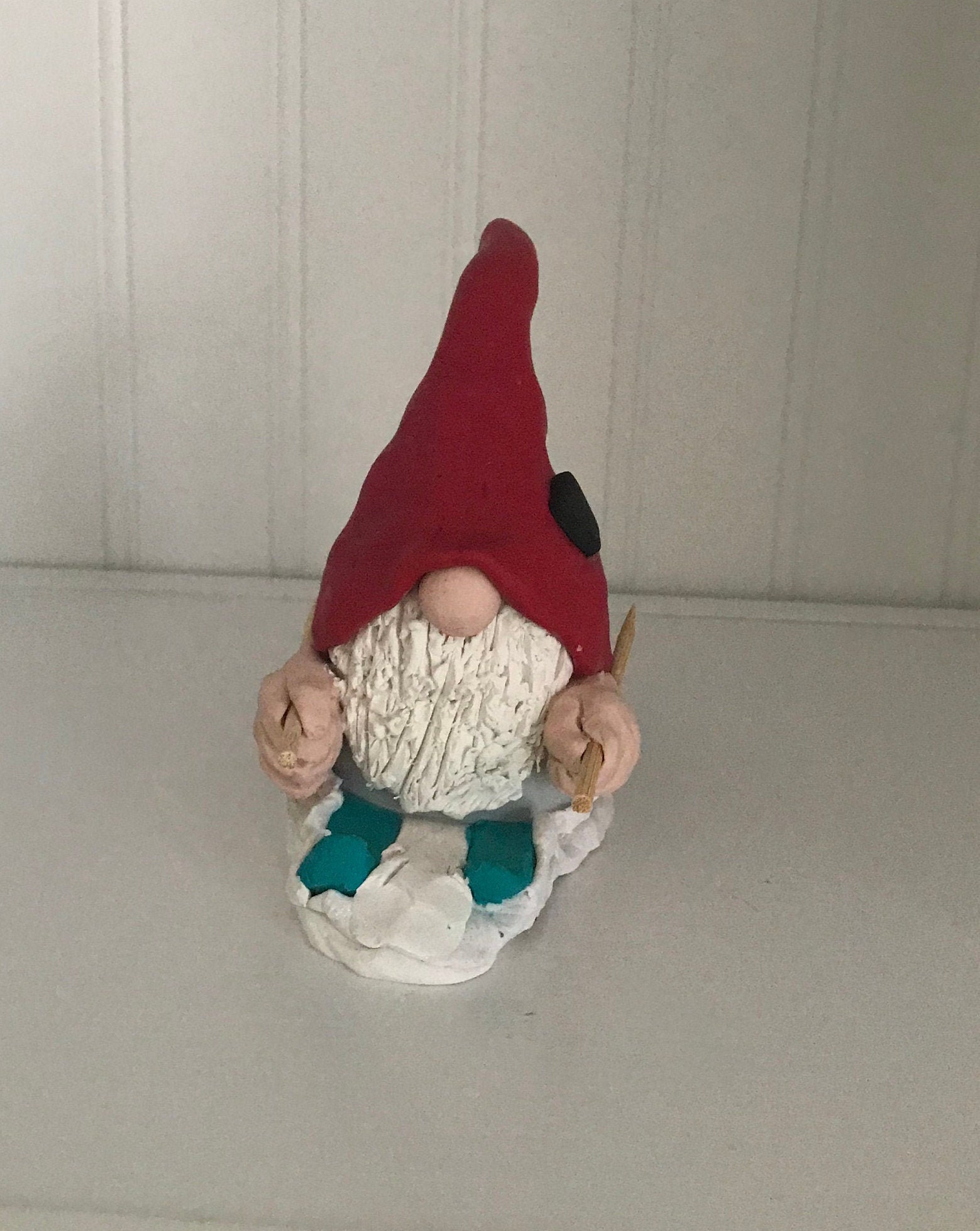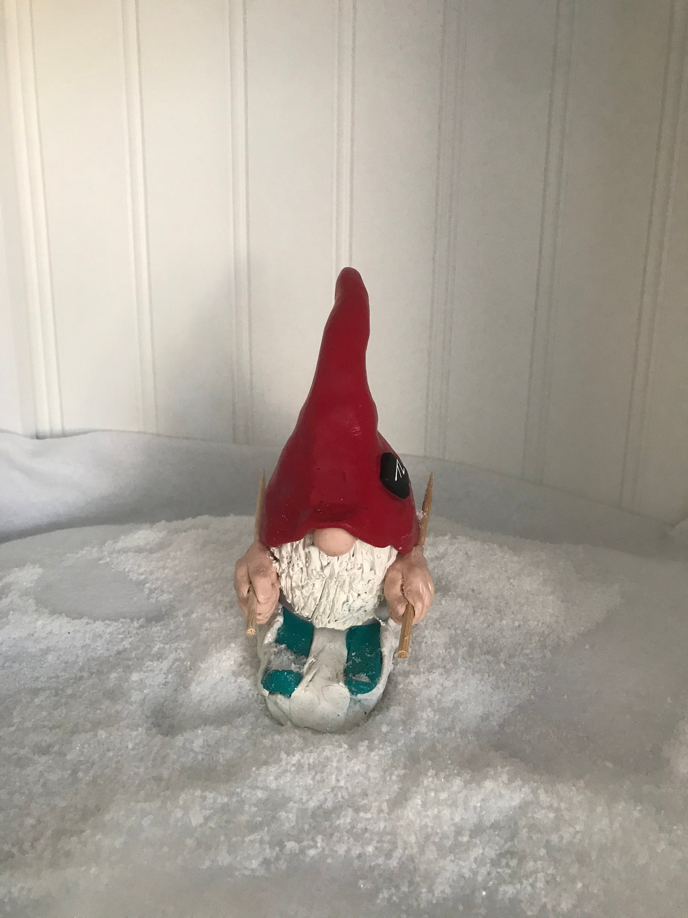 Gnomes love winter sports. This little handmade gnome especially loves snow skiing down tall mountains. This gnome is available as either male or female and a selection of skin tones. Tye hat decoration symbolizes the strength of a mountain. if you’d like a different hat decoration I can do it differently just message