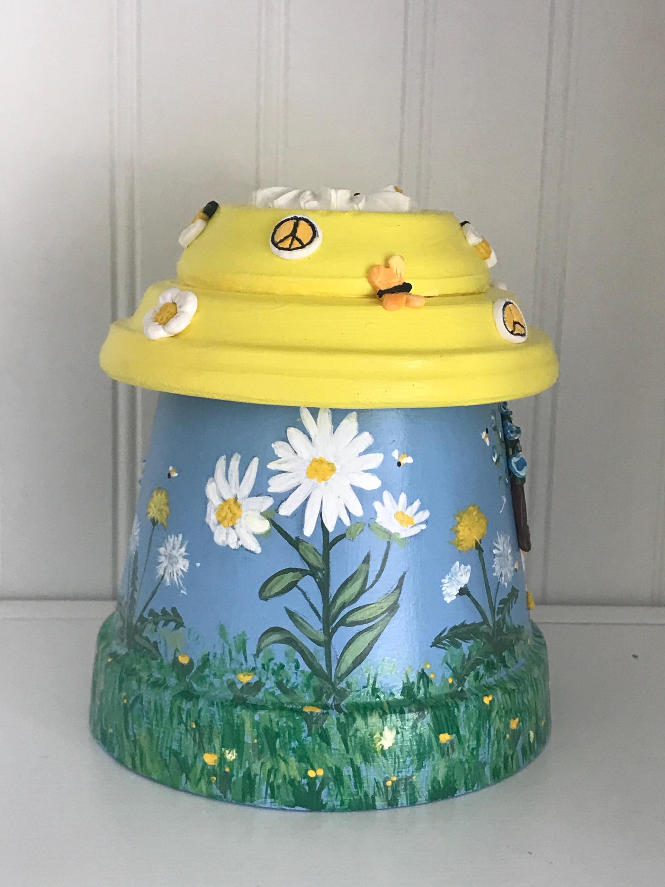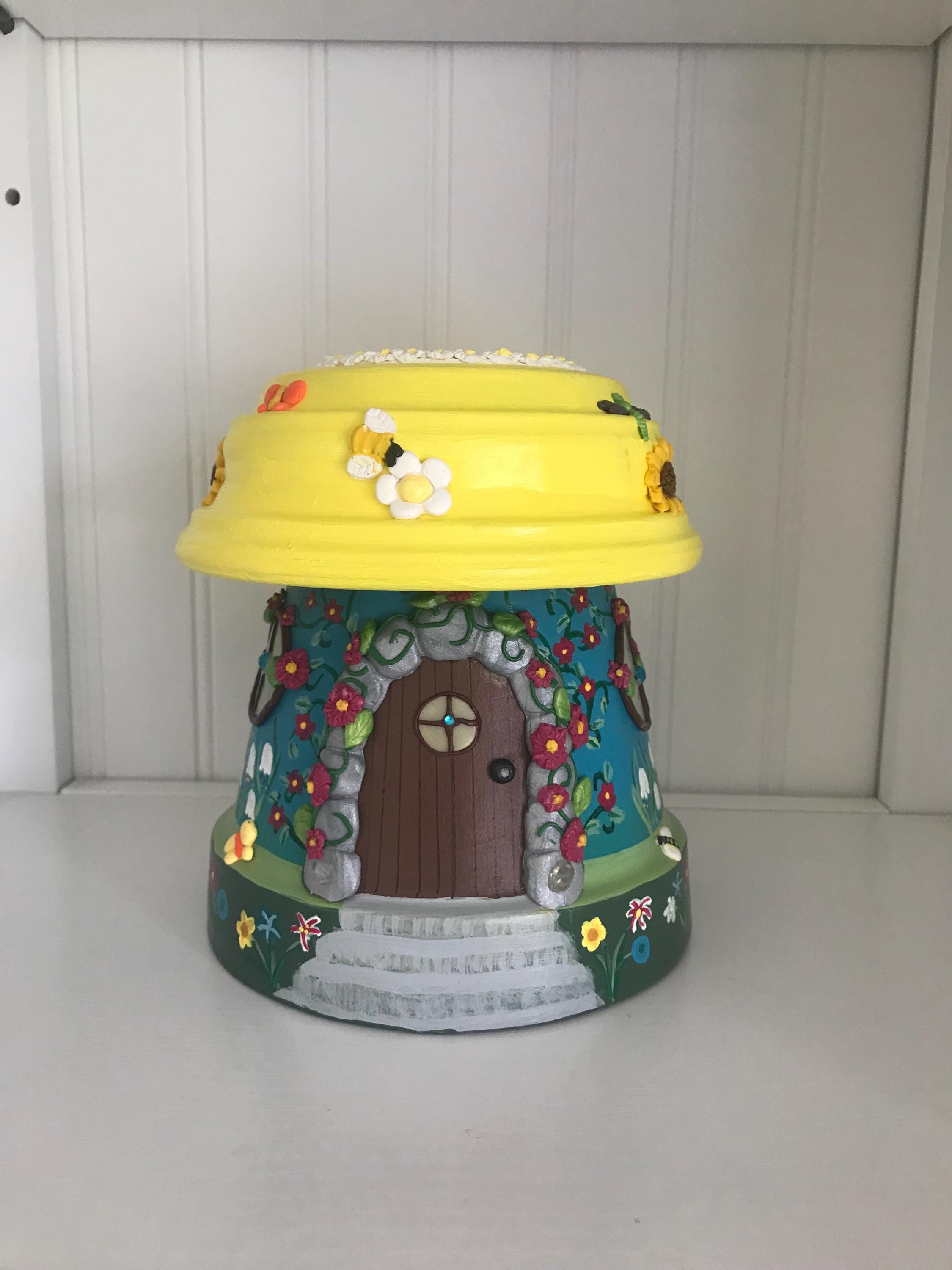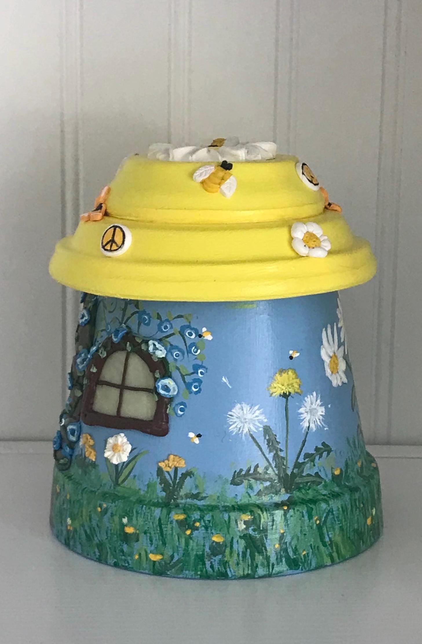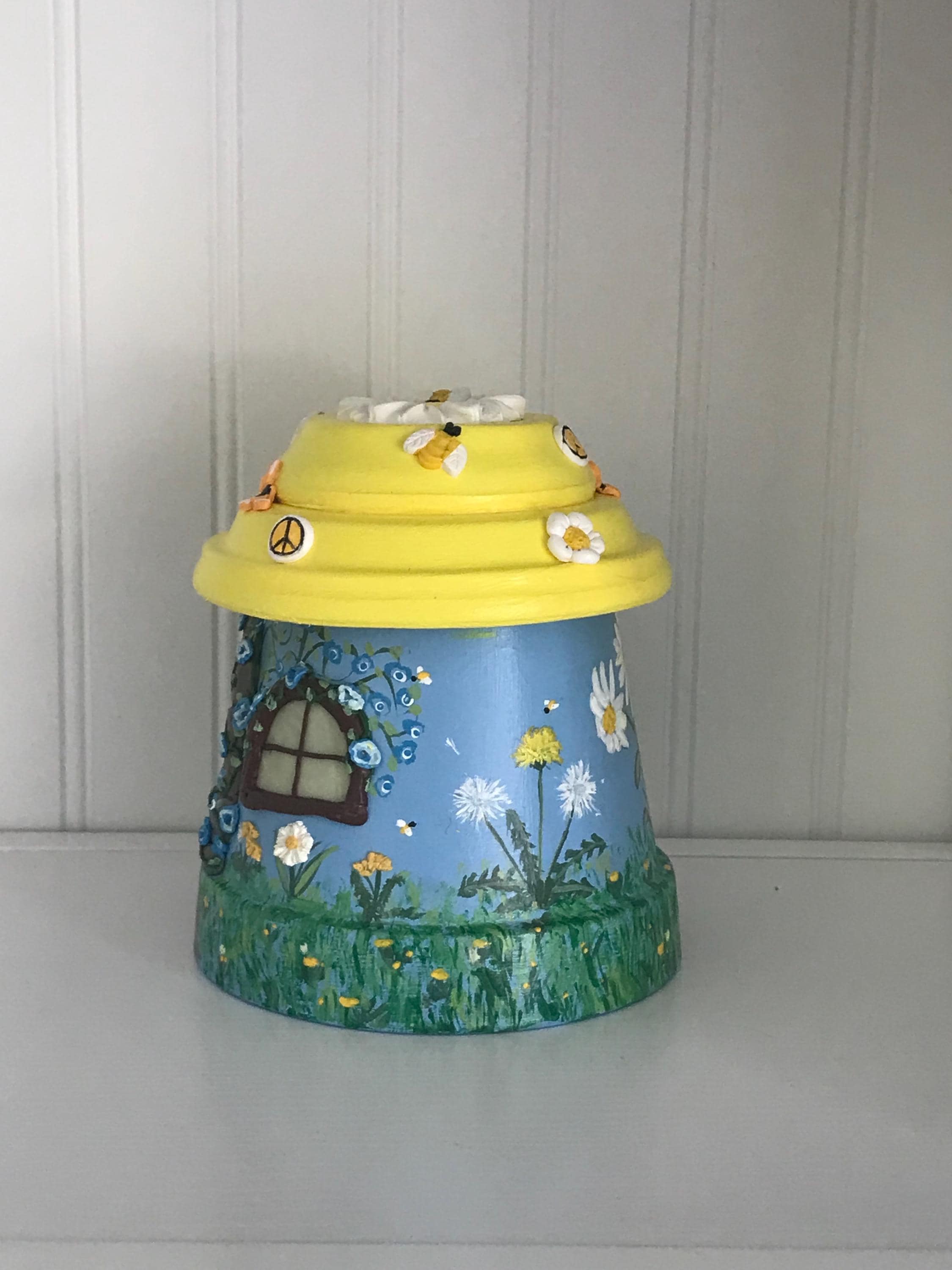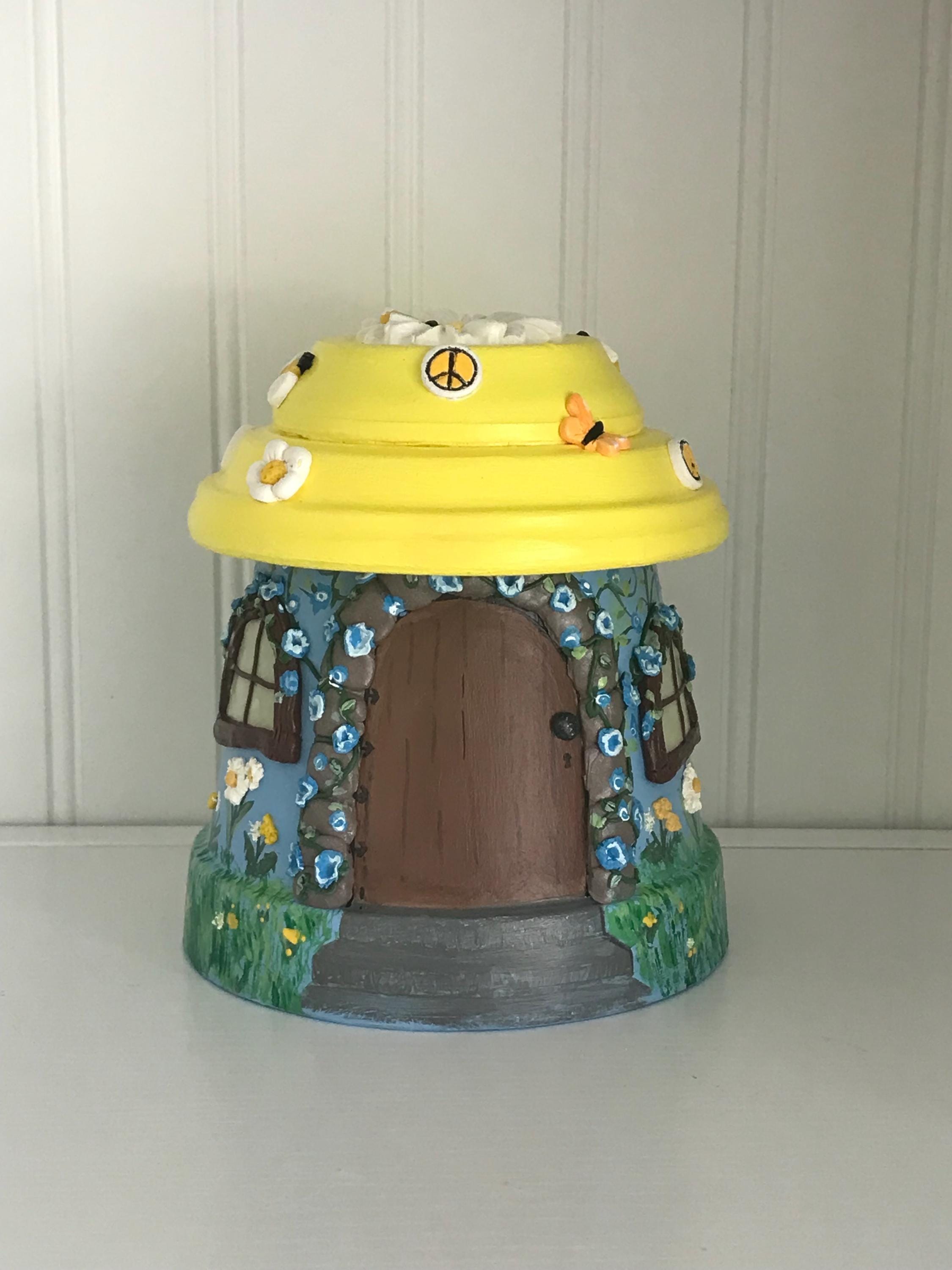 This hand-painted Be at Peace is a fairypot house for your home or garden . Each one is approximately 8” tall and one of a kind with a blue or teal base and yellow roof covered with varying polymer clay decorations. You have a choice of Sunflowers