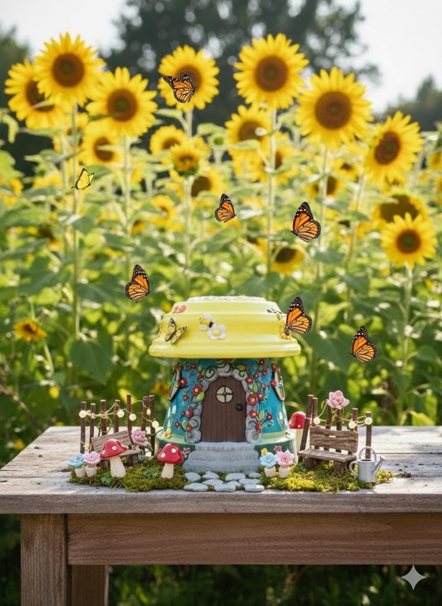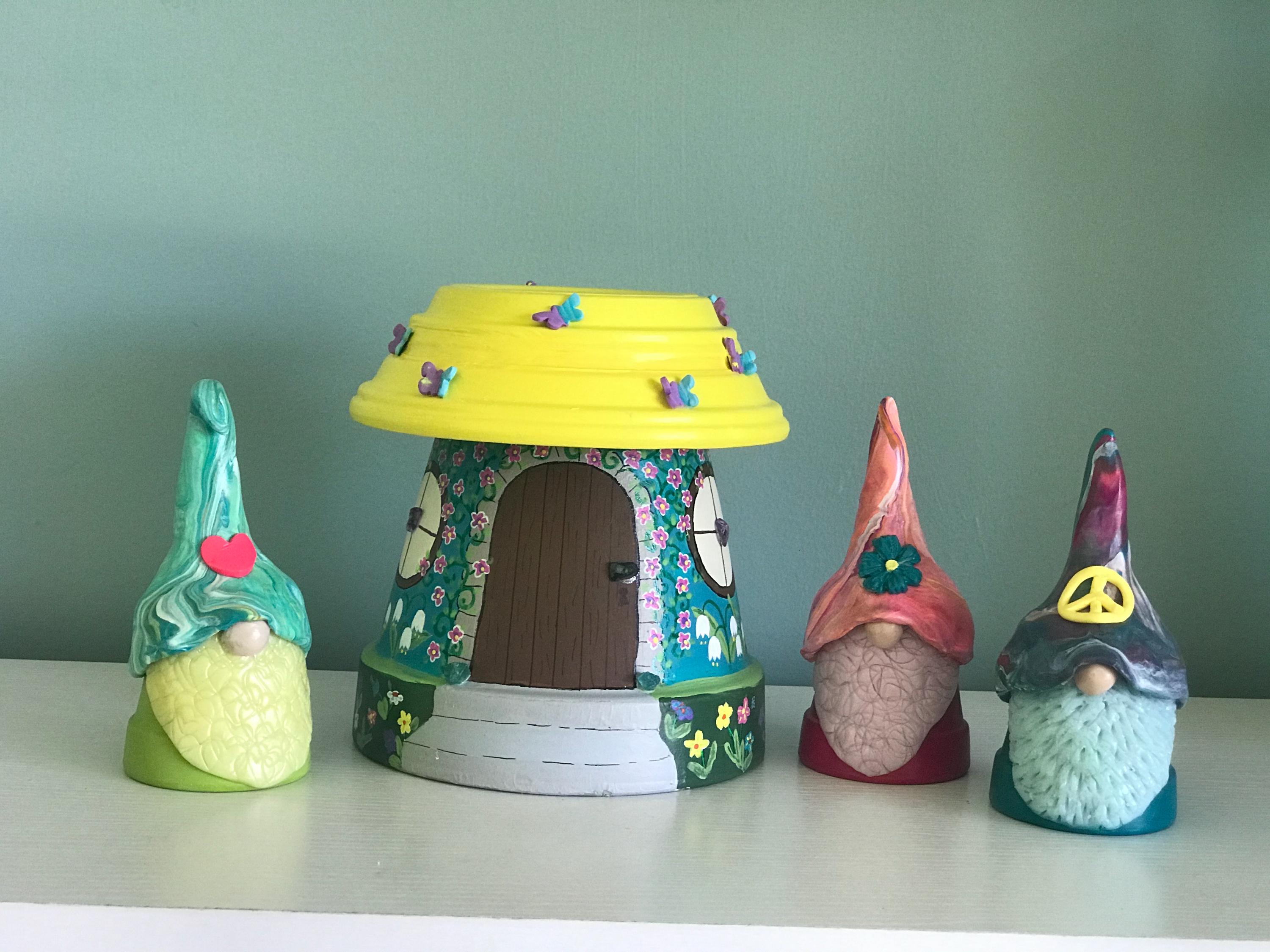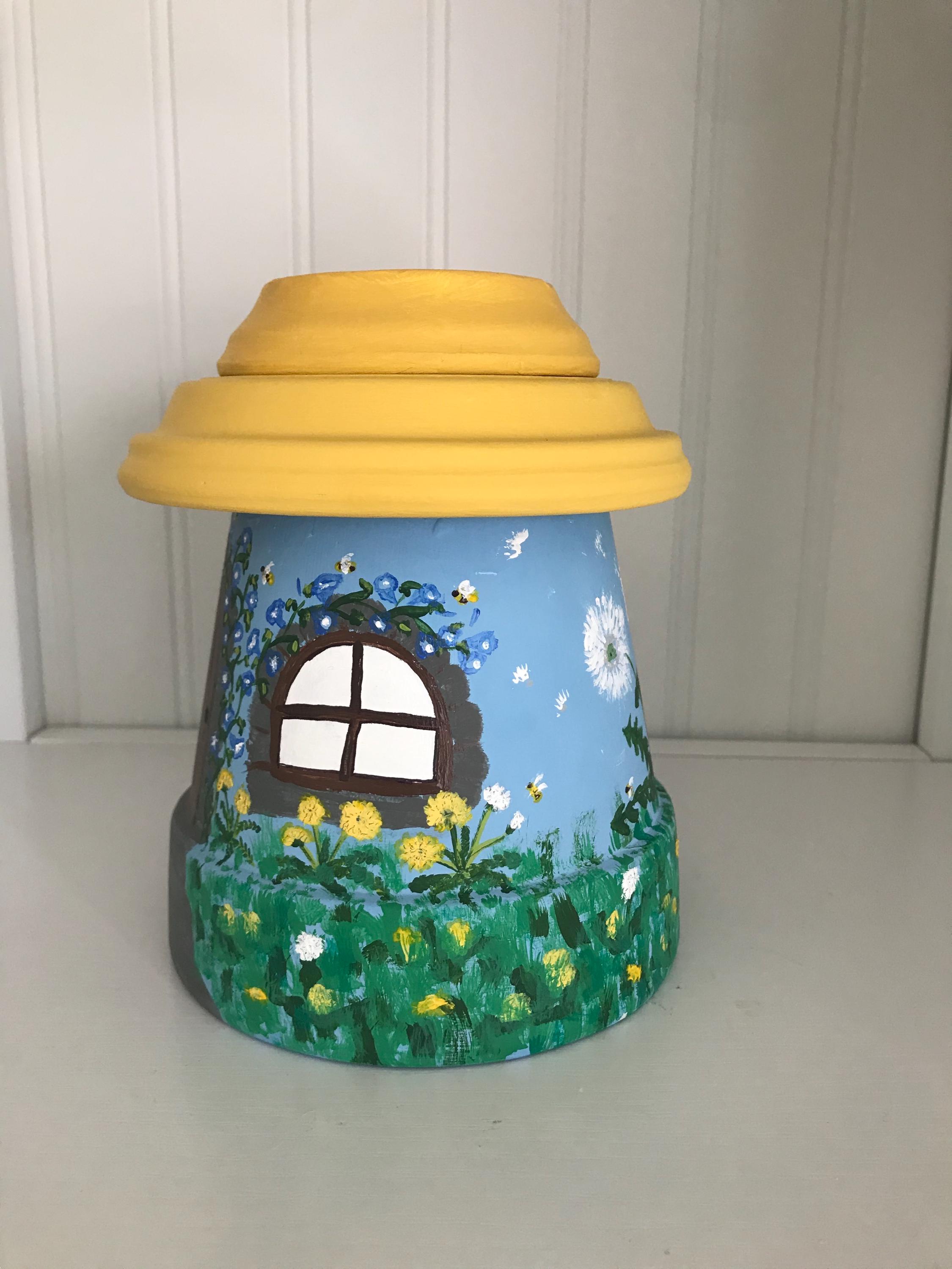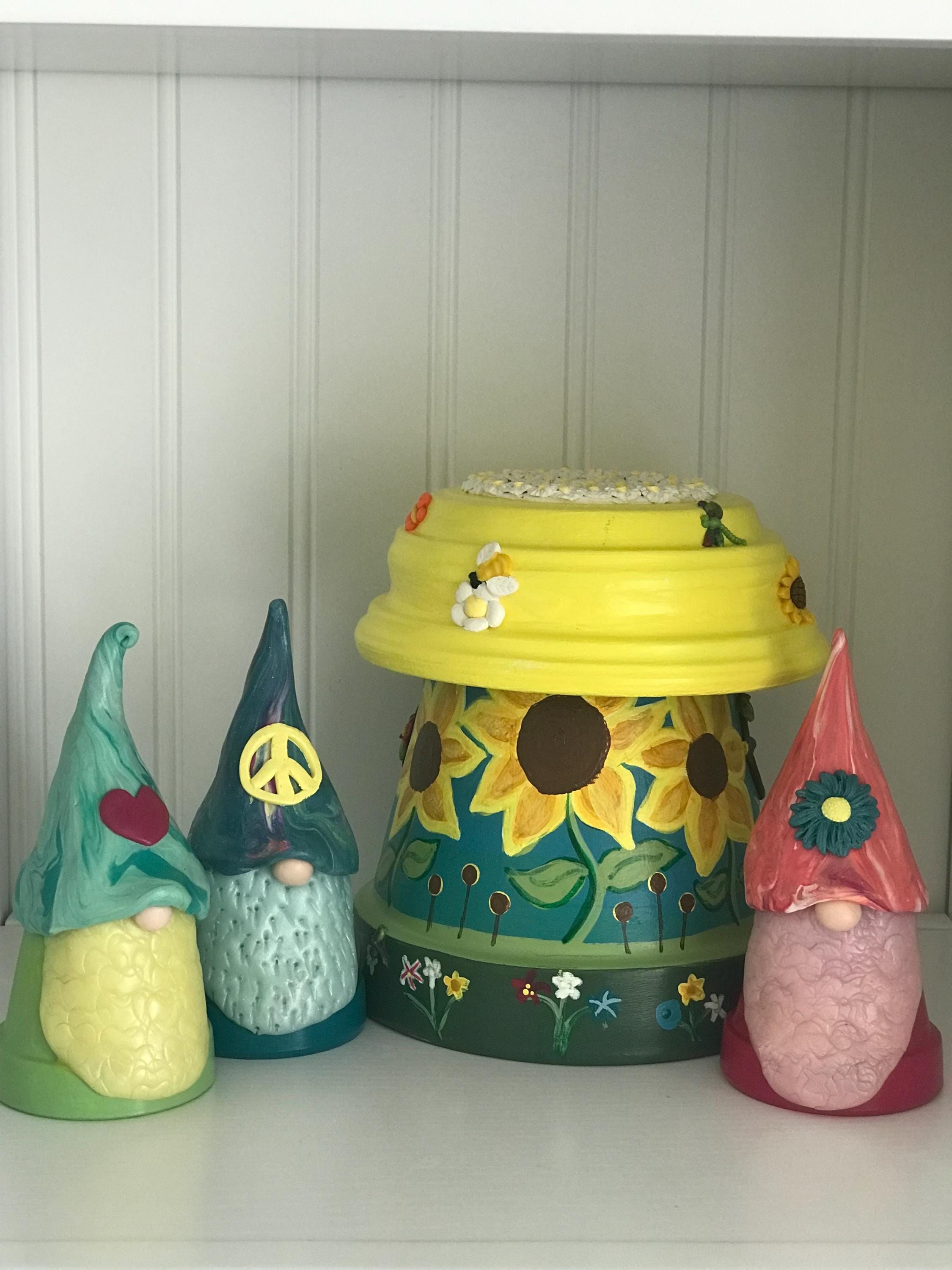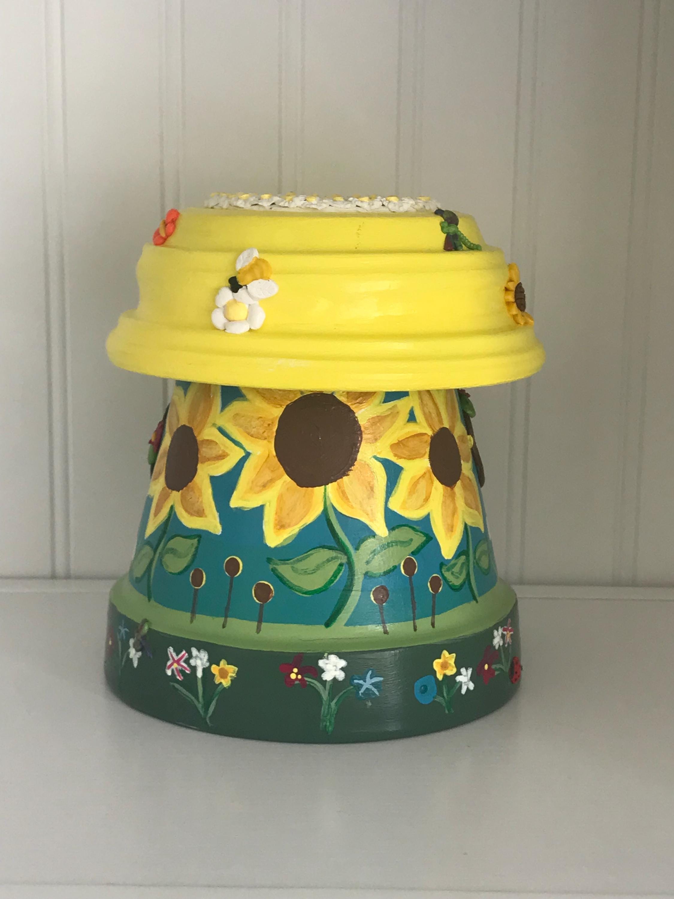 This hand-painted Be at Peace is a fairypot house for your home or garden . Each one is approximately 8” tall and one of a kind with a blue or teal base and yellow roof covered with varying polymer clay decorations. You have a choice of Sunflowers