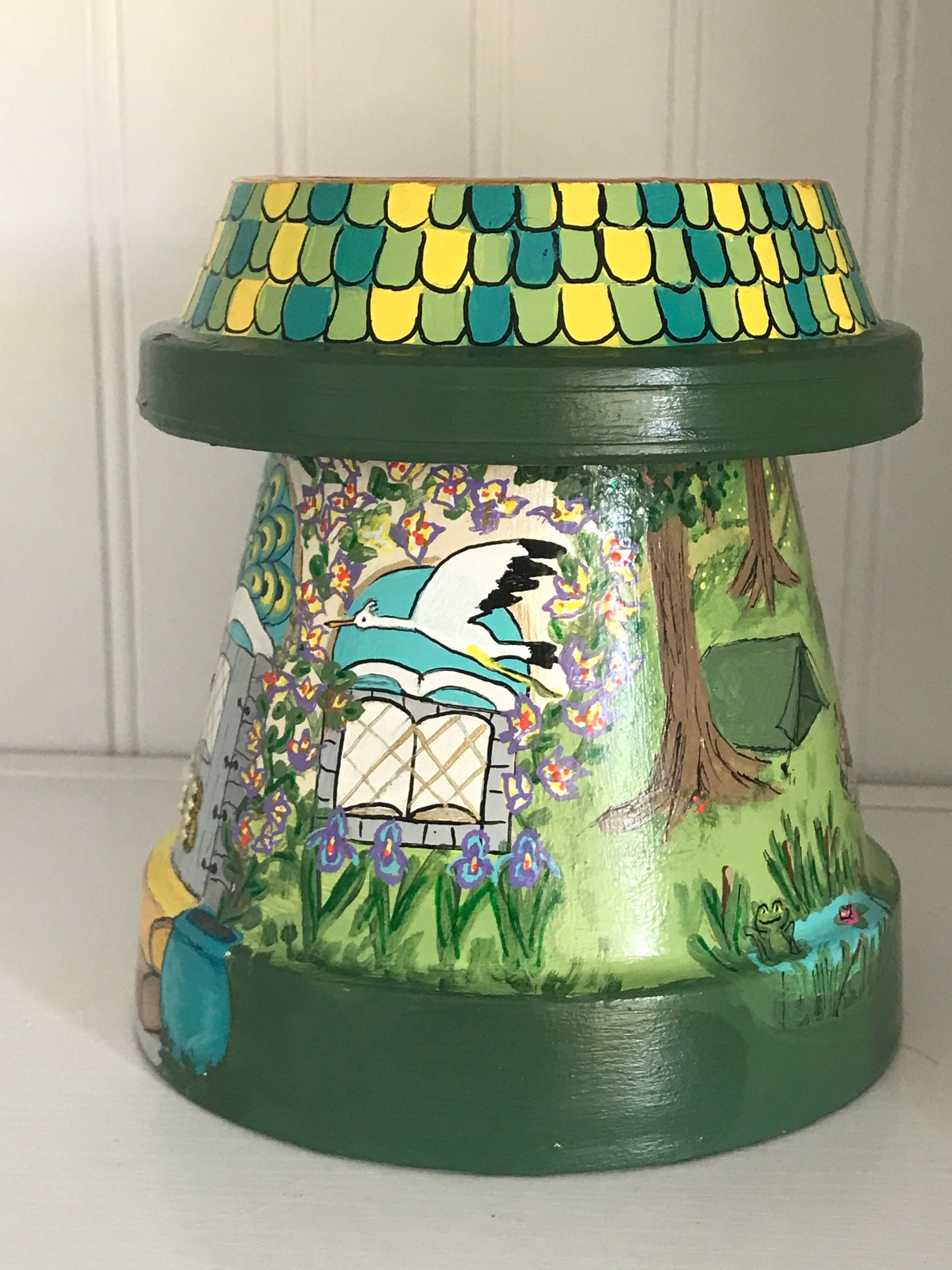 This hand-painted Book Fairy House was designed for readers everywhere. It was originally a custom design for a client and her boys, who love camping.